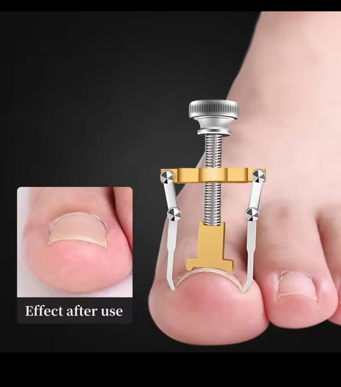 فرورفتگی ناخن در گوشت پا شایع تر بوده و به دلایل مختلف از قبیل استفاده از کفش نامناسب و یا افزایش سن نیز رخ می دهد. این امر دردناک خواهد بود و در اثر عدم جلوگیری و پیشرفت آن ممکن است باعث ایجاد عفونت در بستر ناخن شود. دستگاه ارتودنسی ناخن راحت ترین و کم هزینه ترین روش برای درمان فرو رفتگی ناخن در گوشت می باشد و با تکرار استفاده از این وسیله می توان ناخن را به حالت اولیه بازگرداند. برای استفاده از این وسیله کافیست زیر ناخن را تمیز کرده و قلاب های دستگاه را به دو طرف ناخن همانند تصاویر گیر انداخت. با چرخاندن آرام پیچ اصلی دستگاه و وارد شدن فشار به مرکز ناخن، قوس ناخن به تدریج اصلاح خواهد شد. بهترین زمان استفاده از این دستگاه پس از حمام می باشد.